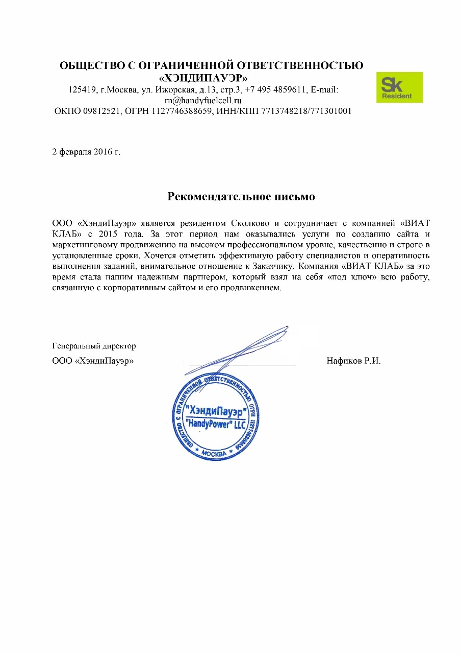 ООО “ХэндиПауэр” явялется резидентом Сколково и сотрудничает с компанией Артизан-тим – ООО “ВИАТ КЛАБ” с 2015 года. За этот период нам оказывались услуги по созданию сайта и маркетинговому продвижению на высоком профессиональном уровне, качественно и строго в установленные сроки. Хочется отметить эффективную работу специалистов и оперативность выполнения заданий, внимательное отношение к Заказчику. Команда Артизан-тим стала нашим надежным партнером, который взял на себя всю работу связанную с корпоративным сайтом и его продвижением.